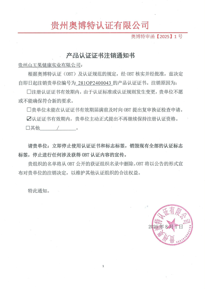 注銷貴州山王果健康實業有限公司產品認證證書通知